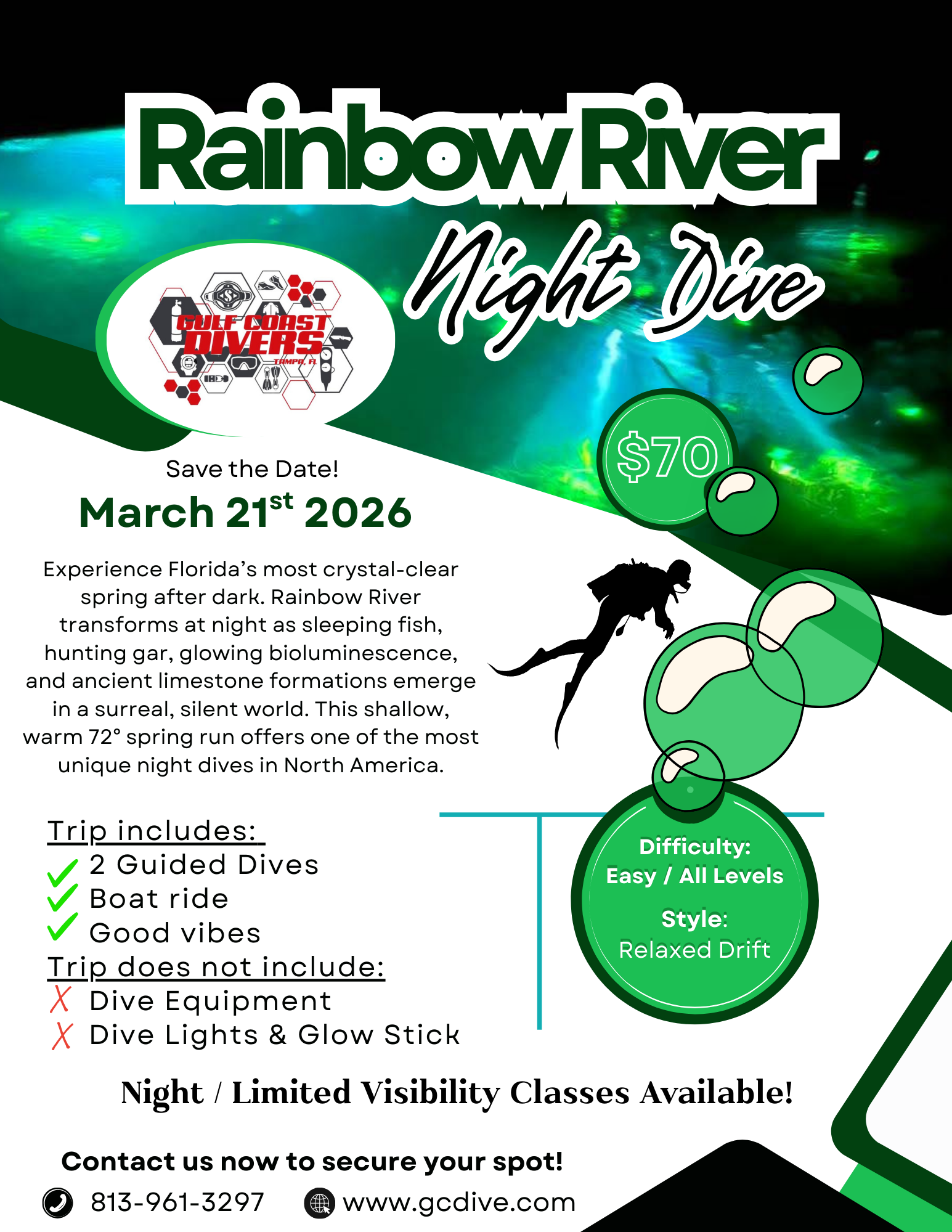Step into a completely different side of Rainbow River as daylight fades and the water settles into calm, moonlit stillness. Whether you’re seasoned in night diving or taking your first plunge after dark, this experience offers something extraordinary.