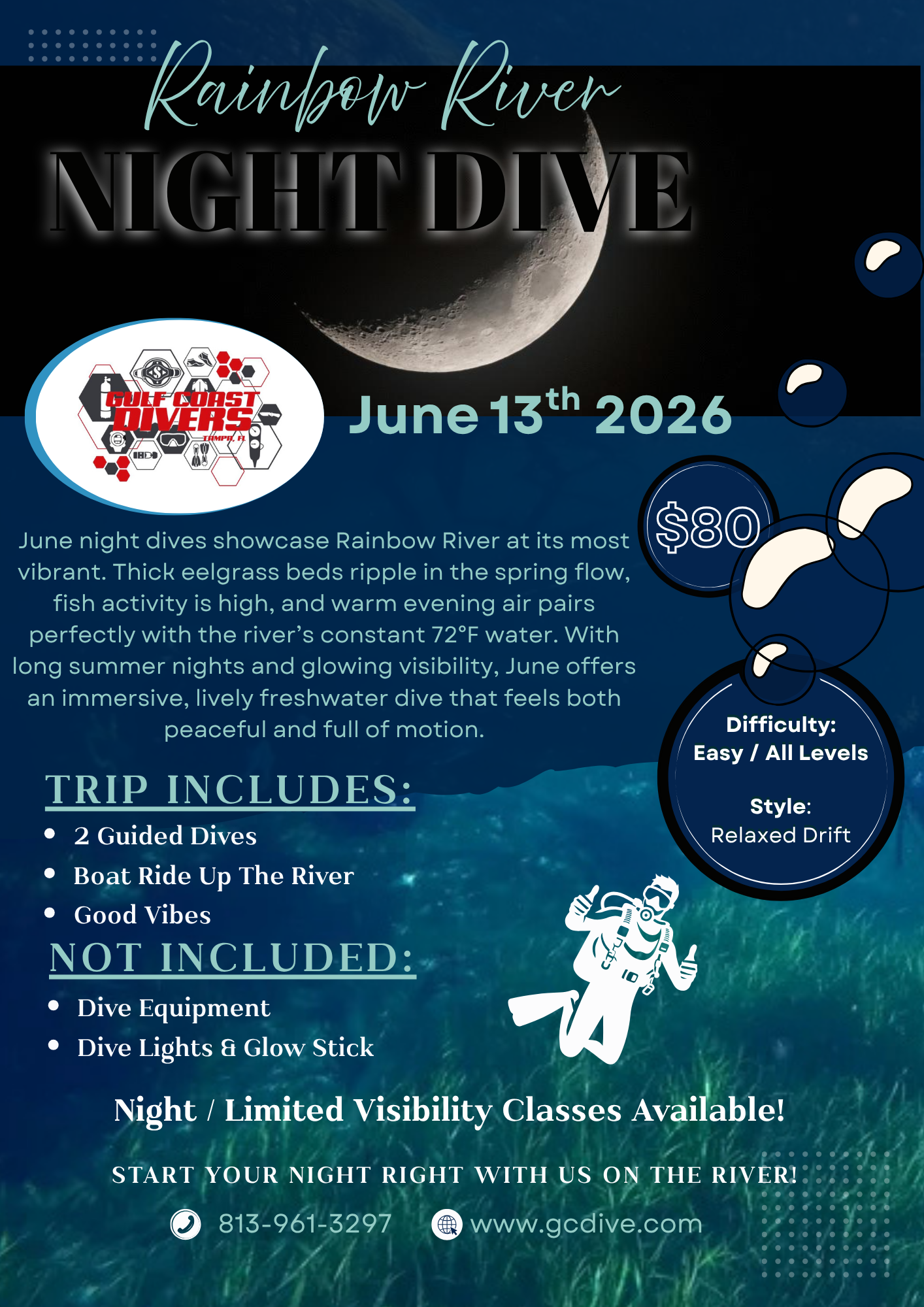 Whether you're a seasoned night diver or a first-timer, the Rainbow River night dive promises an unforgettable experience. Join us for a dive like no other, where the beauty of the underwater world is illuminated by the moonlight, creating memories that will last a lifetime.